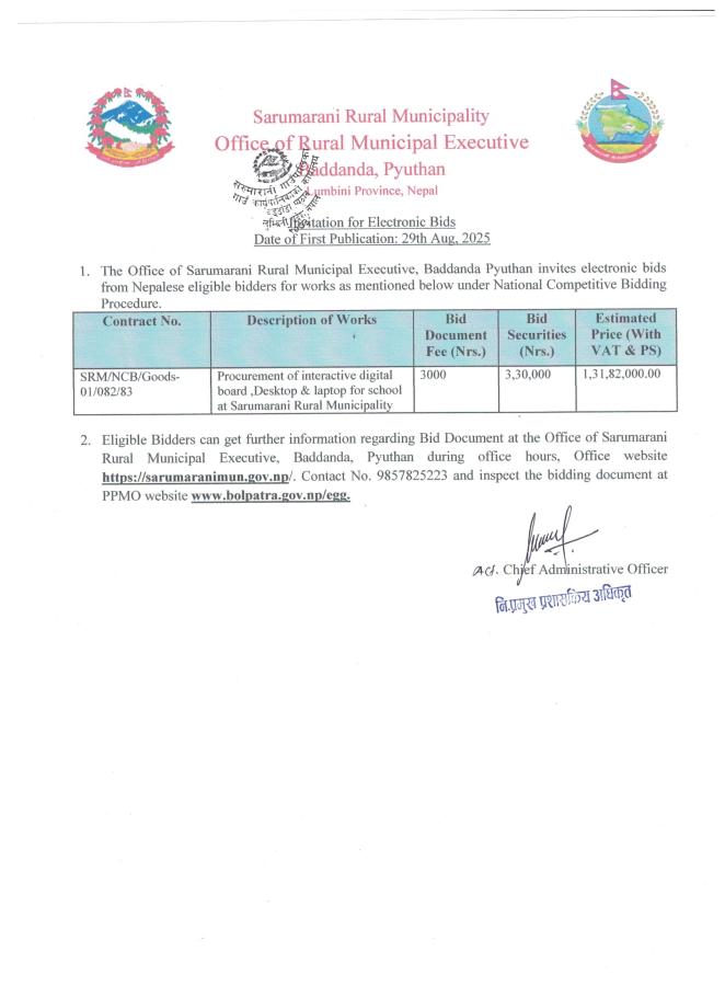 डिजिटल डिस्प्ले बोर्ड, विज्ञापन होर्डिङ्ग बोर्ड, घर सटरभित्ता एवं व्यवसाय स्थलमा राखिएका फुटकर विज्ञापनहरुको विज्ञापन कर संकलन बारे ठेक्का बन्दोबस्त सम्बन्धी शिलबन्दी प्रस्ताव आव्हानको सूचना।