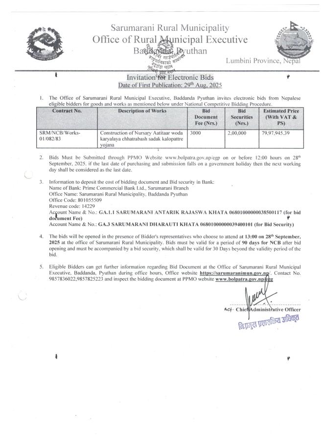 डिजिटल डिस्प्ले बोर्ड, विज्ञापन होर्डिङ्ग बोर्ड, घर सटरभित्ता एवं व्यवसाय स्थलमा राखिएका फुटकर विज्ञापनहरुको विज्ञापन कर संकलन बारे ठेक्का बन्दोबस्त सम्बन्धी शिलबन्दी प्रस्ताव आव्हानको सूचना।