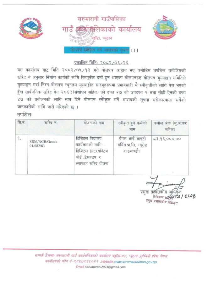 डिजिटल विद्यालय कार्यक्रमको लागि डिजिटल ईन्टरयक्टिभ बोर्ड ,डेस्कटप र ल्यापटप खरिदको बोलपत्र स्वीकृत आशयको सूचना